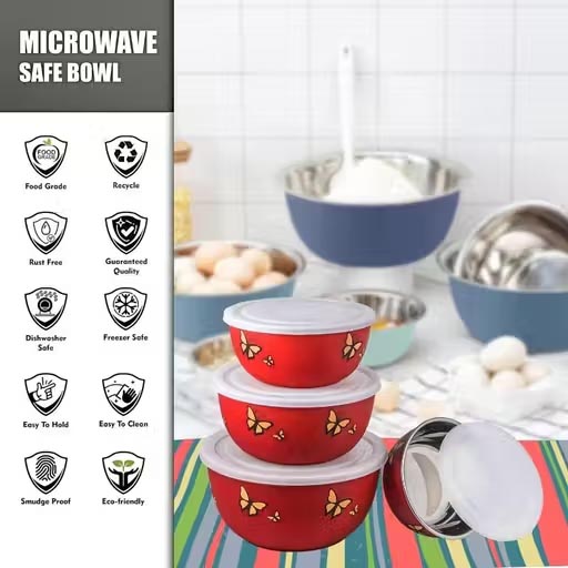 These bowls are the world famous in the kitchenware industry for good reasons. Functional and beautiful bowls are truly the perfect for your dish. Set of 3 pieces stainless steel bowl which perfect for everyday use. Here your salads, snacks and all other foods are best presented. The 3 piece bowl set is a real eye-catcher on every table. Also it is microwave safe.